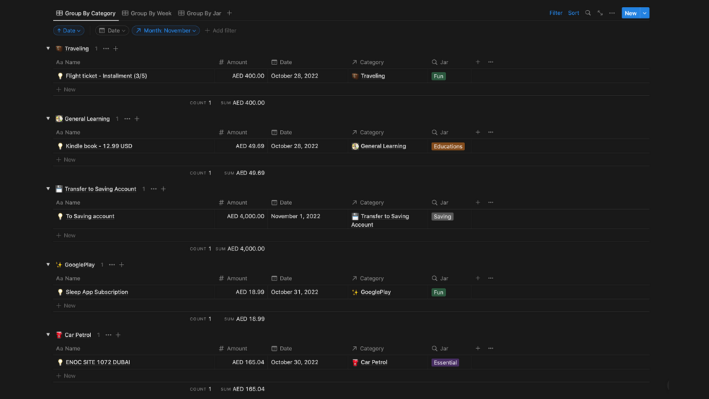 • Monthly tracker section: to track every single expenses, and each expenses should be pick from expenses category.